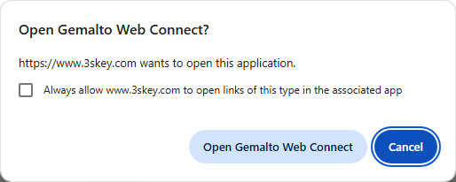 Note: You must select the option Open Gemalto Web Connect within 10 seconds. If you do not click Open or Cancel within that delay, the page assumes that you do not use Web Connect, and attempts to start or install SConnect. If SConnect is not available, the connexion will then not proceed. The option Always allow opens Web Connect transparently during your next visits to the 3SKey portal. If you did not have time to click this option, you can refresh or reload the page to see the prompt again.